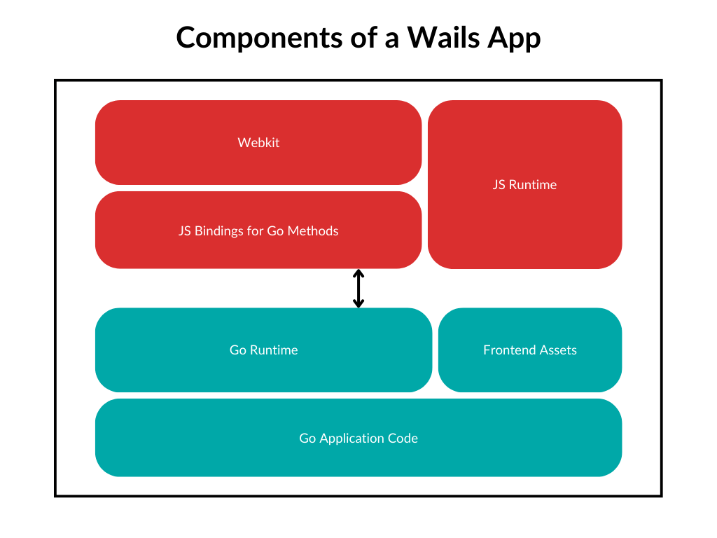 Wails 应用程序是一个带有一个 webkit 前端的标准的 Go 应用程序。 应用程序的 Go 部分由应用程序代码和一个运行时库组成, 该库提供了许多有用的操作,例如控制 应用程序窗口。 前端是一个 webkit 窗口,将显示前端资源。 前端还可以使用运行时库的 JavaScript 版本。 最后,可以将 Go 方法绑定到前端,这些将显示为可以调用的 JavaScript 方法,就像它们是原生 JavaScript 方法一样。